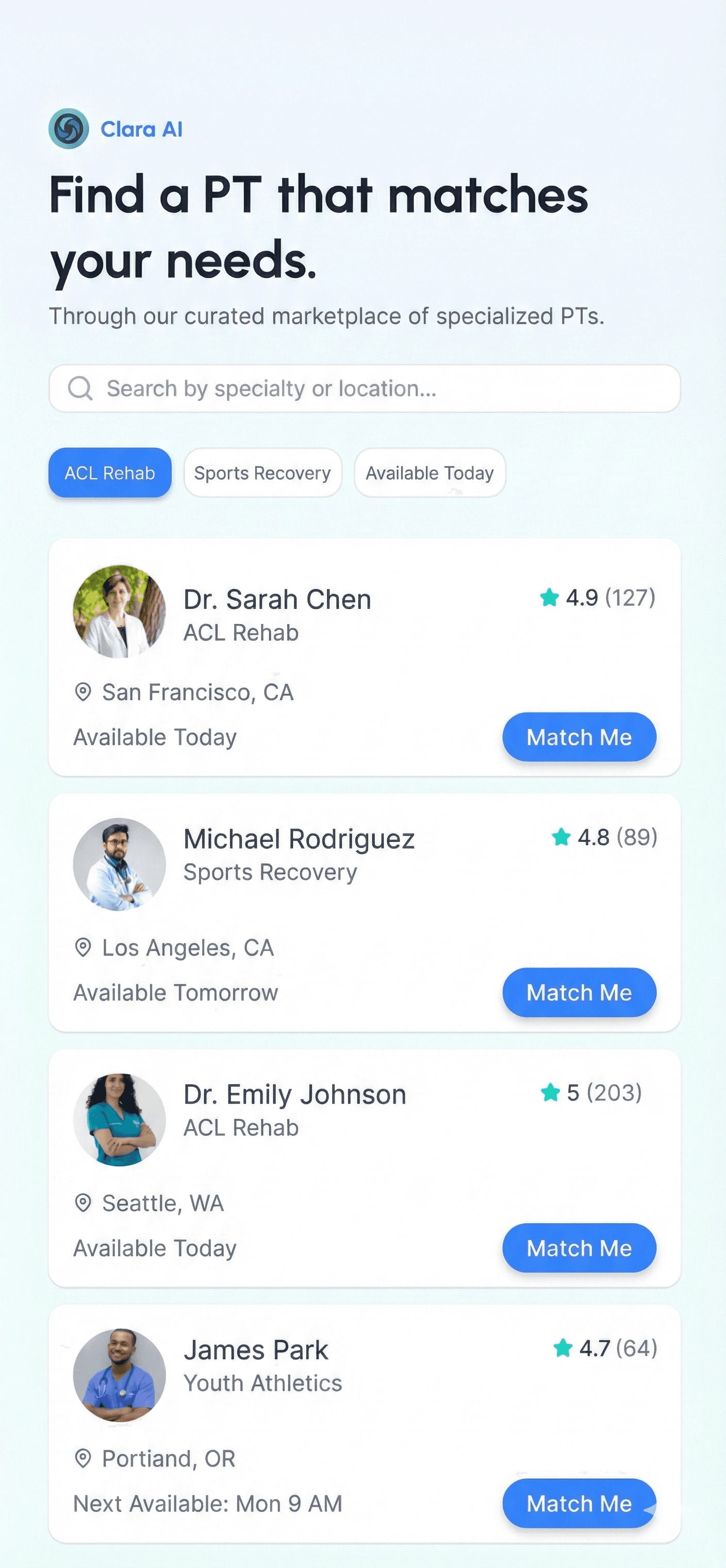 Choose a PT who truly understands you. From ACL specialists to rec sport experts, we've got you covered.